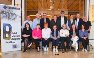 Stehend: Piotr Wislicki, Avi Rosenthal, André Goldstein, Christoph Heubner (Vizepräsident IAK), Emanuele Fiano, Marton Szekhelyi, Dr. Sascha Feuchert (Gast), Jehuda Haber